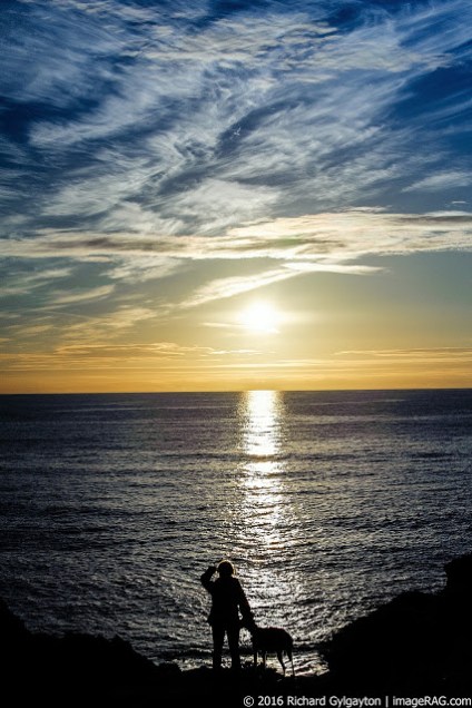 As to the photograph, it was made on the same day as the one in my previous post. The same sunset, the same sky, the same sea and shore. My wife is looking out to the Pacific with our greyhound at her side. Staring at possibilities? The future? The Will of Heaven? There is a path of light leading from the figures to the edge of the horizon. There is always a path. And there is always a song.