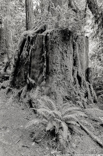 The trail runs along the creek and there are, of course, massive ferns in addition to thick green moss hanging from the trunks and branches of redwood trees. And other than the sound of water flowing and the wind rushing through the vegetation there is nothing to hear but the sheer cathedral-like silence of the natural world.