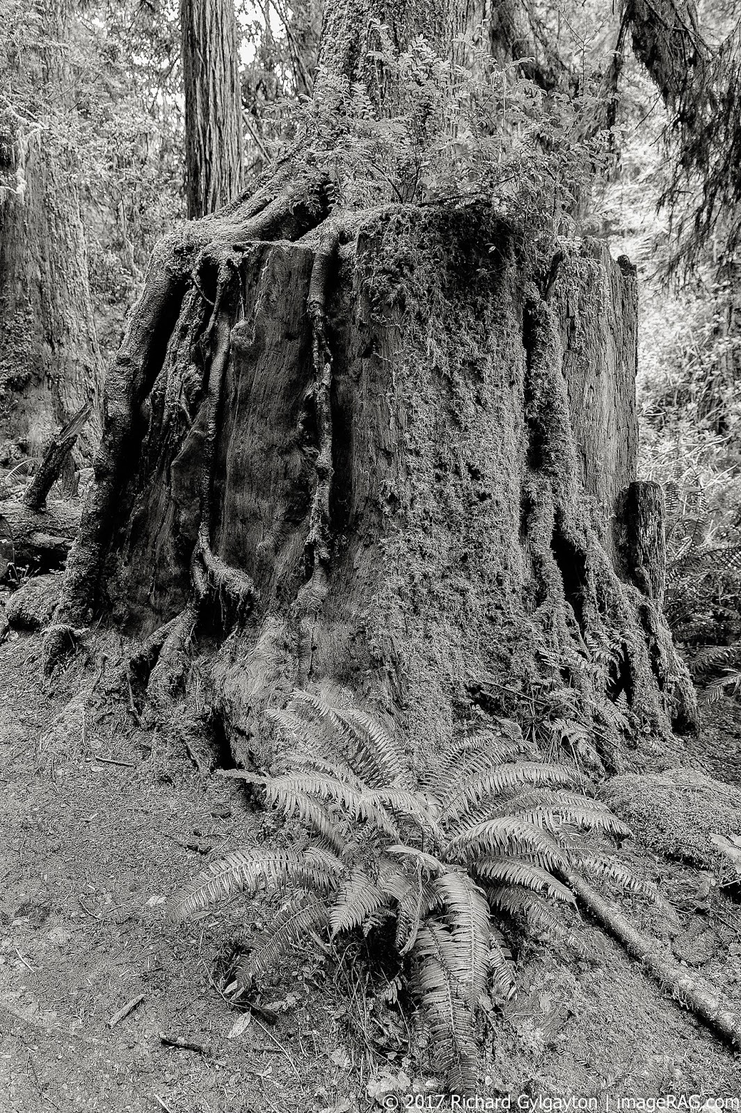 On my final day in Mendocino in March of 2017 I wanted to investigate yet another memory rooted in a place where I had walked many years before. Just a mile or so north of Mendocino in Russian Gulch State Park there is a trail called Fern Canyon. There are actually a number of trails by that name in a series of California State Parks along the north coast, and the moniker defines the trails precisely. The paths are similar; narrow tracks through tall canyons bordered by a thick forest with a creek running down to the sea. These are California rain forests very much like the ones up in the Olympic Peninsulain Washington state, but smaller and not quite as epical.